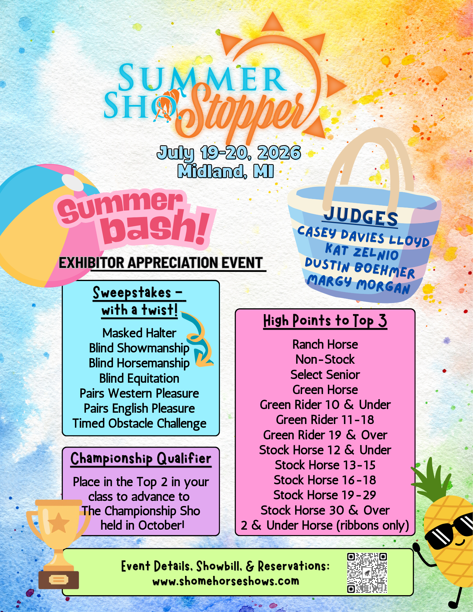 Summer means horse shows and you don't want to miss the unique offerings of the Summer ShoStopper. Featuring sweepstakes classes with a twist! Off Side Showmanship, Masked Halter, Pairs Eng/West Pleasure, Blind HMS/Eq, and last, but not least, the Timed Obstacle Challenge! It's sure to be A Show Like No Other!